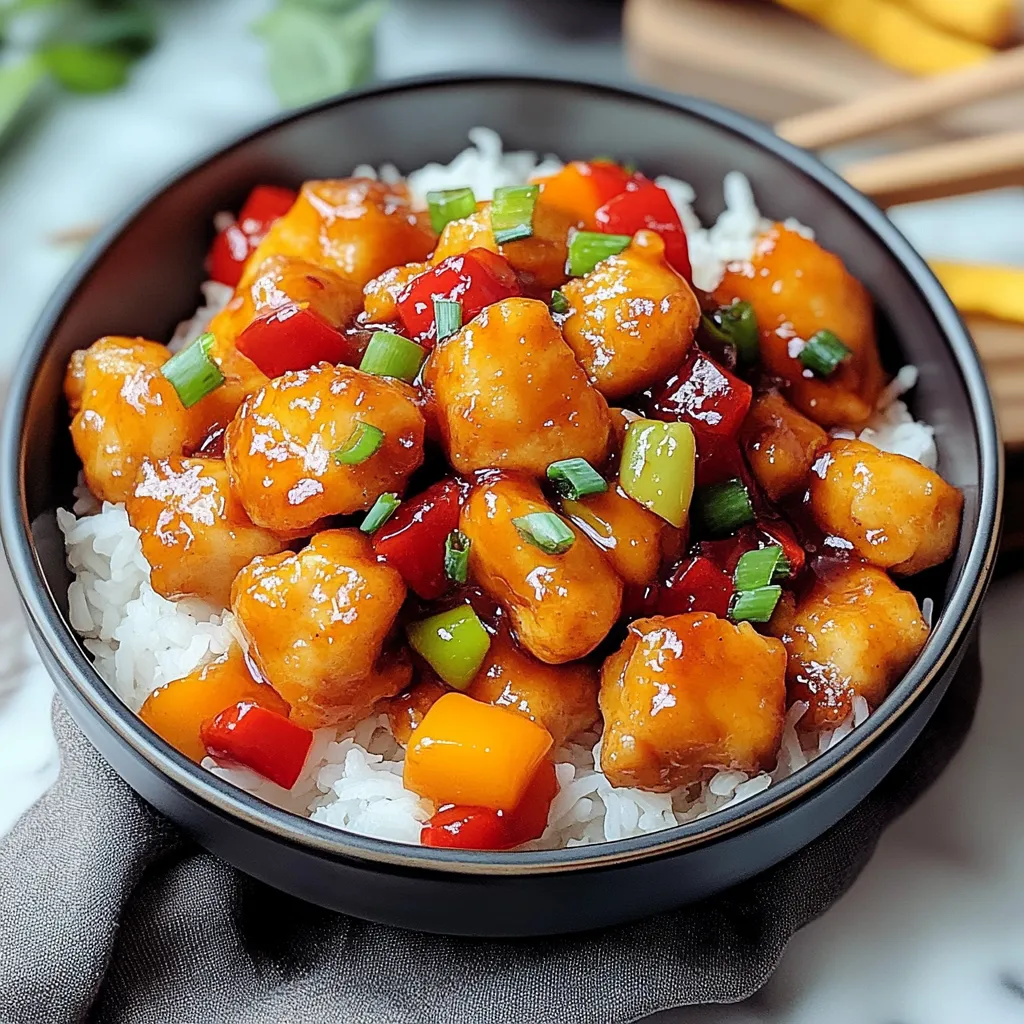 The presentation of your Sweet and Sour Chicken can enhance its appeal significantly. Serve it in a vibrant bowl lined with fresh greens like romaine lettuce or spinach for contrast against the colorful dish. Garnish with sesame seeds or chopped green onions on top for an added pop of color. You can also arrange it alongside fluffy white rice shaped into small mounds using a bowl – this adds elegance while being practical for serving!