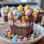 - In clear cups or jars, layer crumbled brownies at the bottom, followed by whipped cream and mini chocolate eggs. Repeat layers until cups are filled.