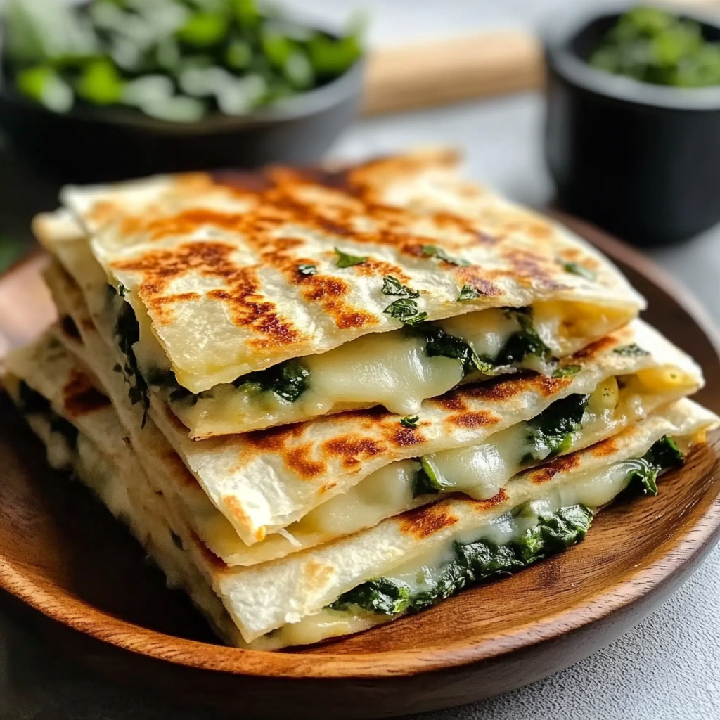 Indulge in these delicious mozzarella spinach quesadillas, where gooey fresh mozzarella meets vibrant sautéed spinach, all wrapped in a crispy tortilla. Perfect for any meal, these quesadillas are quick to prepare and sure to impress your family and friends. Serve them as a hearty lunch, a cozy dinner, or an appetizer at gatherings. Each bite delivers a satisfying crunch paired with melted cheese and nutritious greens—a delightful treat that brings joy to every occasion.