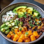 Indulge in the warmth of the Irresistible Sweet Potato, Beef & Avocado Protein Bowl. Featuring tender, marinated beef, caramelized sweet potatoes, and creamy avocado slices, this dish is a celebration of flavors and nutrition. Perfect for cozy dinners or meal prep, it’s a wholesome experience that nourishes both body and soul.