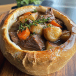 While the stew simmers, prepare your bread bowls. Hollow out large round loaves of bread, ensuring there’s enough room for the stew inside without breaking through the crust. Once the stew is ready, ladle it into each bread bowl and serve hot.
