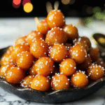Italian Struffoli (Honey Balls) Luscious are small, deep-fried dough balls coated in honey and often adorned with colorful sprinkles or candied fruit. Traditionally enjoyed during festive seasons in Italy, these treats feature a delightful crunch on the outside while remaining soft on the inside. The honey gives them a rich sweetness that makes them irresistible at celebrations like Christmas or weddings.