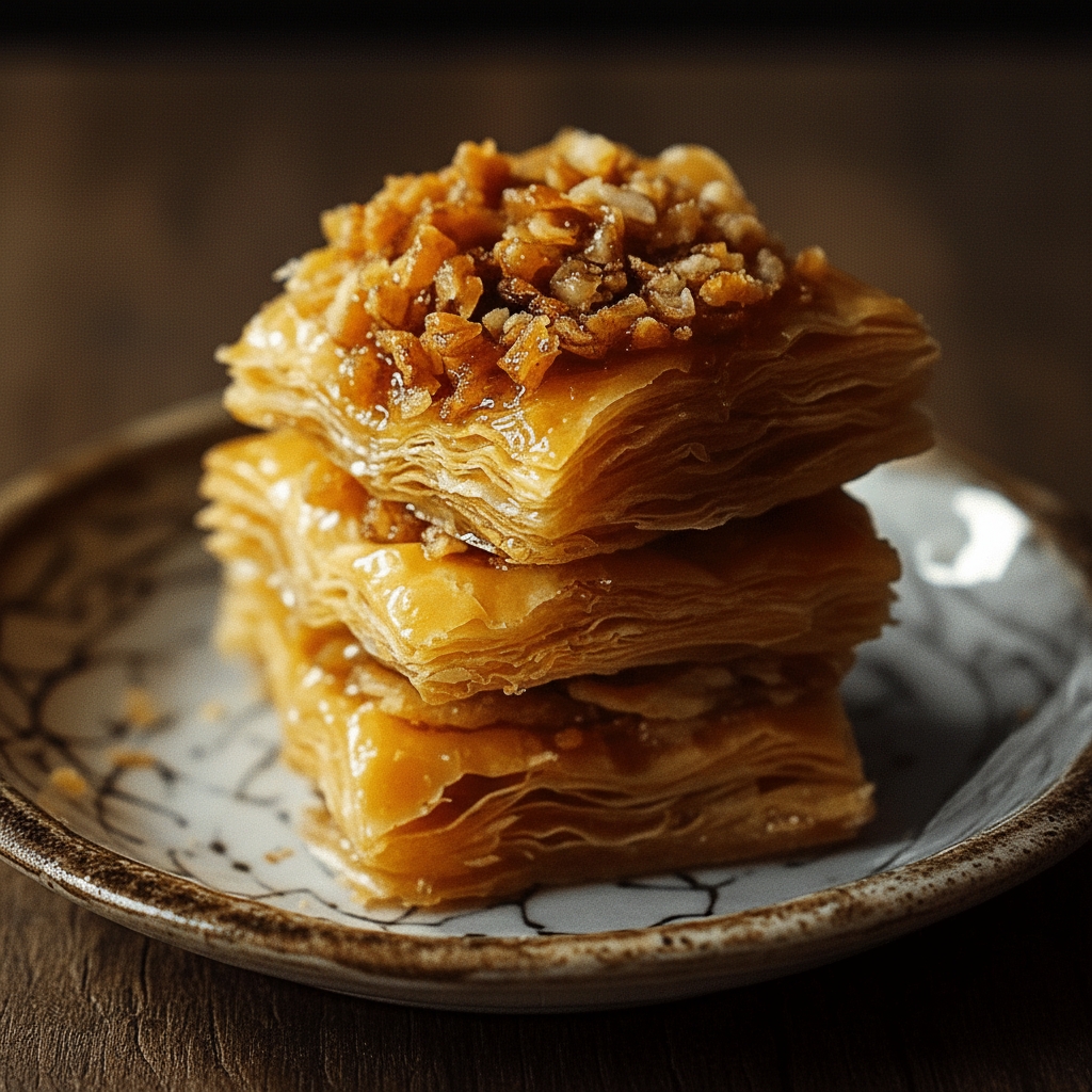 Follow these simple steps to prepare this delicious dish: First Step : Preheat Your Oven Preheat your oven to 350°F (175°C). Prepare a baking dish by greasing it lightly with nonstick cooking spray or butter. Second Step : Prepare The Nut Filling In a mixing bowl, combine finely chopped mixed nuts with ground cinnamon. Stir well until the nuts are evenly coated with cinnamon. Third Step : Layer The Phyllo Dough Unroll your phyllo dough carefully. Place one sheet into your prepared baking dish and brush it lightly with melted butter. Repeat this process with about six sheets for a sturdy base. Fourth Step : Add The Nut Mixture Spread an even layer of your nut mixture over the phyllo sheets. Continue layering by adding more phyllo sheets brushed with butter followed by another layer of nuts until all ingredients are used. Fifth Step : Cut Into Pieces Using a sharp knife, cut your layered baklava into diamond or square shapes before placing it in the oven. This will help with even cooking and easier serving later on. Sixth Step : Bake And Drizzle Bake for approximately 30-35 minutes or until golden brown. Once out of the oven, immediately drizzle honey over the hot baklava for that final touch of sweetness. Transfer to plates and enjoy these savory bites warm or at room temperature!
