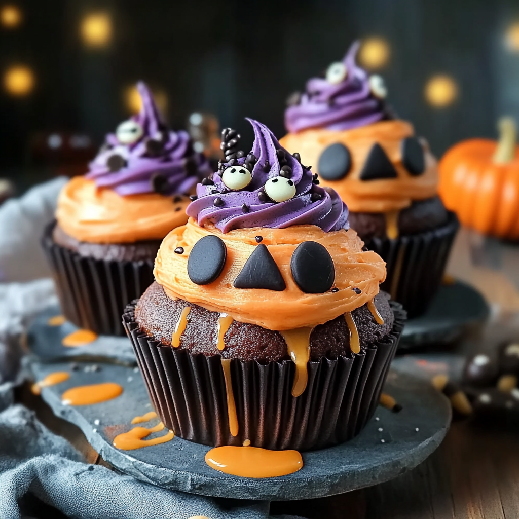 Delight your guests with these spooky Halloween cupcakes that are as fun to make as they are to eat! Each cupcake is soft, moist, and topped with rich, creamy frosting, perfect for adding a whimsical touch to your Halloween festivities. Whether adorned with ghostly faces or dripping chocolate “blood,” these treats will enchant both kids and adults alike. Get ready for a hauntingly good time!
