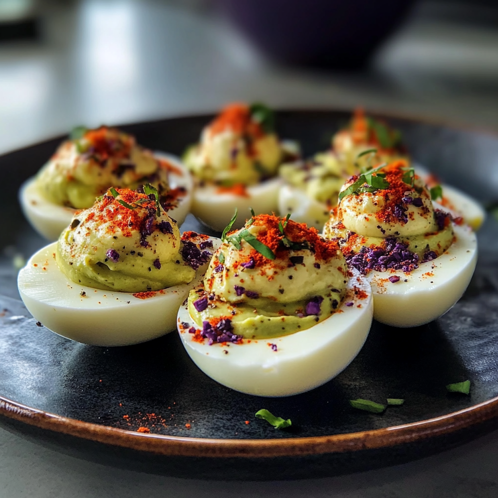 Themed Garnishes: Top each egg with seasonal toppings like crumbled bacon for a “witch’s hair” effect or use paprika to create “blood” spots, enhancing both flavor and appearance.