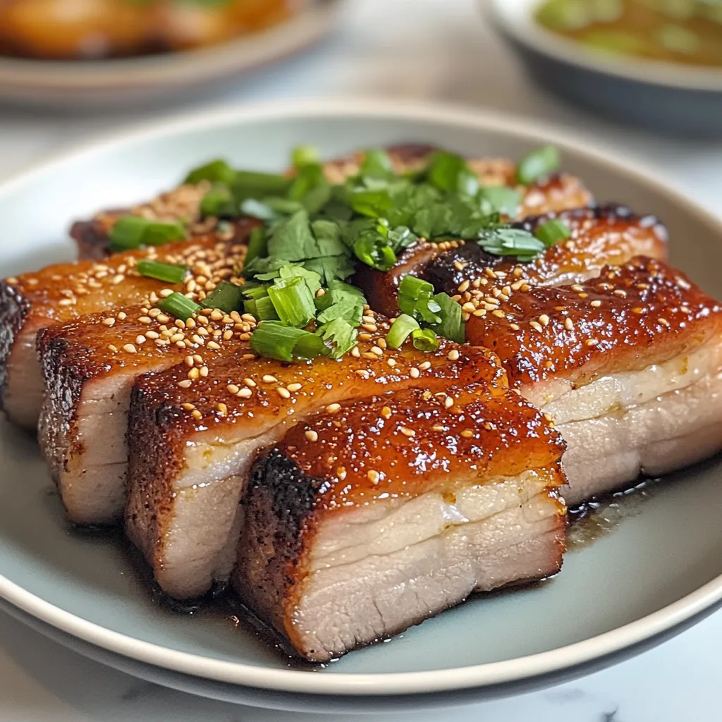 This delicious pork belly pairs wonderfully with sides like steamed vegetables tossed with sesame oil or fragrant jasmine rice drizzled with soy sauce. You could also consider serving it alongside spicy kimchi or tangy slaw for added crunch and flavor contrast—these combinations create harmony on every plate!