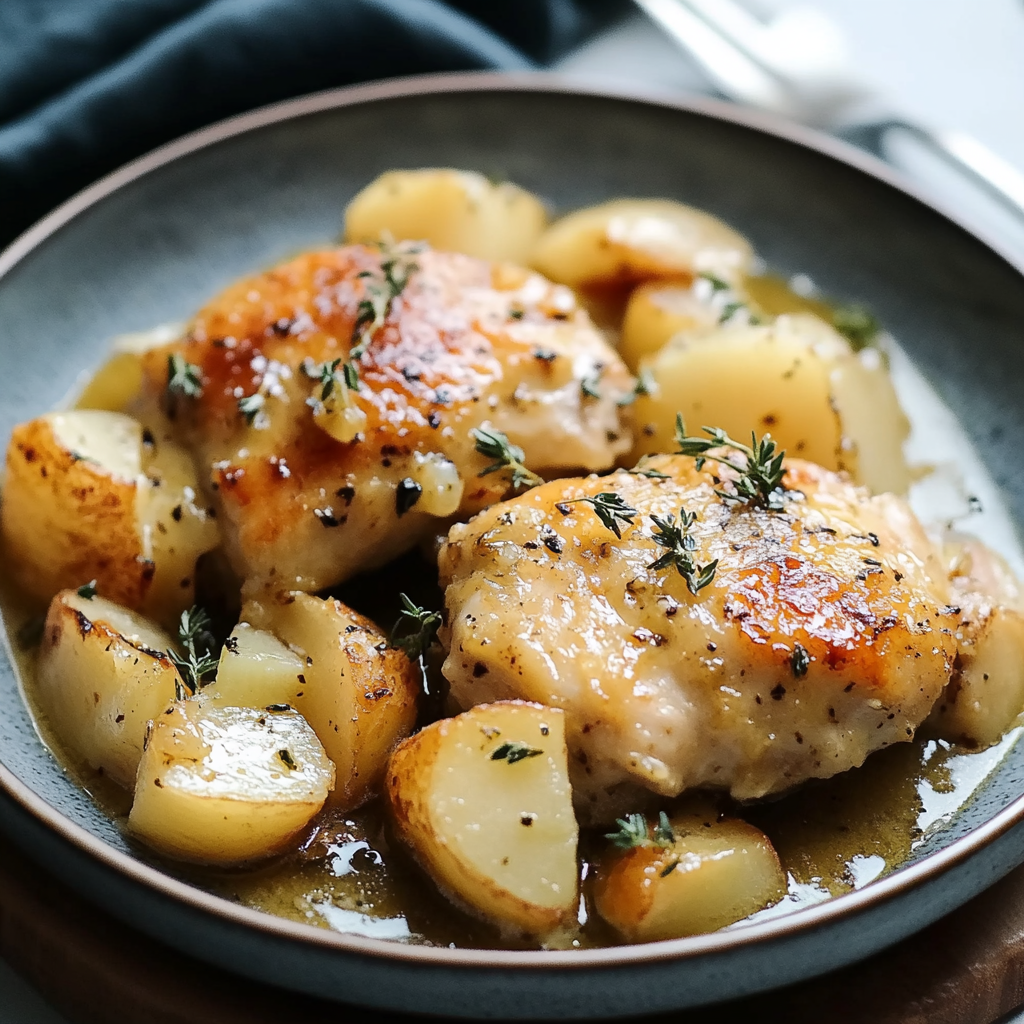 Transfer everything onto plates, spooning extra sauce over each serving. Garnish with additional thyme if desired for an aromatic touch.